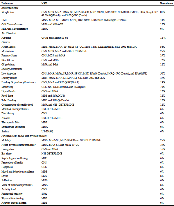 Psychological, social and physical factors are also considered in a few NSTs as indicators, such as mobility (25%), neuro-psychological problems (19%) and living alone (16%). Other factors used in NSTs included eating alone (6%) psychological wellbeing (6%), perception of health (6%), happiness (6%), mood and behaviour problems (6%), and stress (6%). Some NSTs explored the physical functioning and activity levels through items such functional capacity (6%) and activity level (6%). Physical functioning and activity pursuit patterns are unique to MDS (6%). Only one NST (6%) NSI-DETERMINE incorporated financial status and consumption of alcohol as indicators of malnutrition.