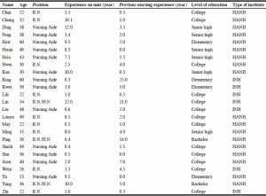There were 25 participants, including 12 RNs and 13 NAs. Ages ranged from 22 to 60 years old (average age = 45 years). Relevant characteristics are listed in Table 1. Four themes were identified in the data analysis. They were ‘impact of a resident’s death,’ ‘reflections on entangled feelings,’ ‘insufficiencies,’ and ‘tremendous pressure of informing death.’ The essential meaning of NH resident death and dying for nursing staff can be summarized as being a strong impact that has made them aware of the need for proper education on end-of-life care, especially incorporating cultural background.