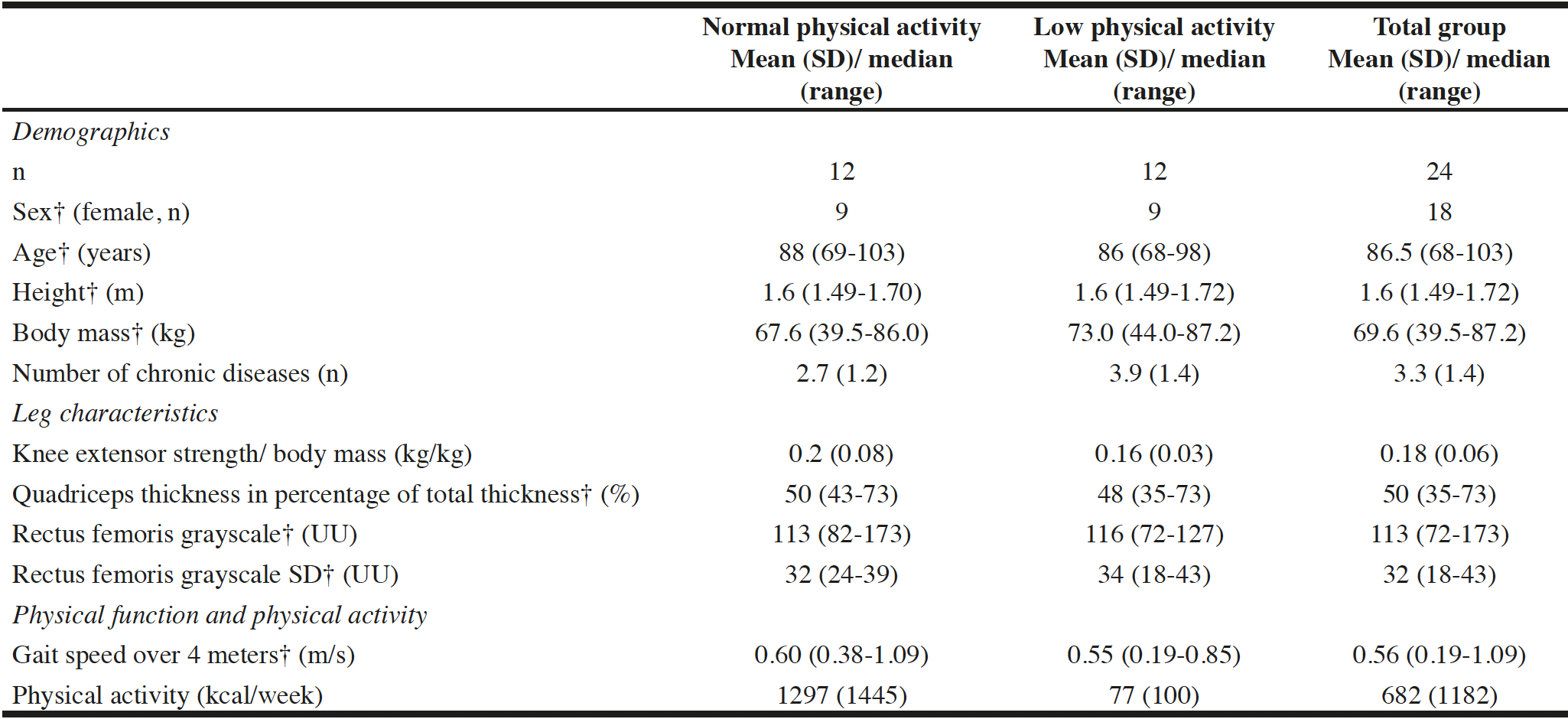 The study sample included n=24 participants (18 women), median age (range) 86.5 (68-103) years, with n=12 participants in each physical activity-subgroup (Table 1).