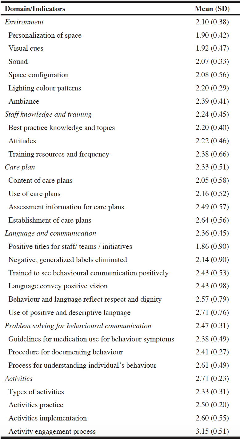The mean score of the six PCC domains was 2.31/4 (SD=0.36). Table 4 shows domain scores and component indicators. Environment had the lowest score (2.10/4, SD=0.38). Lack of visual cues and personalisation of space were especially deficient. Next lowest was Staff Knowledge and Training (2.24/4, SD=0.45).This was followed by Care Plans (2.33/4, SD=0.51), Language and Communications (2.36/4, SD=0.45), and Problem-Solving Processes for Behavioural Communications (2.47/4, SD=0.31). Even the best performing domain, Activities (2.71/4 SD=0.23) fell short of the score of 3 (signifies strength). Only Activity Engagement Process (a sub-domain of Activities), scored 3.15/4, SD=0.51, meaning while all the key components of PCC were present, only Activity Engagement Process could be considered a strength.
