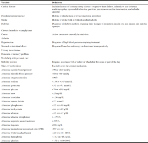 Frailty is a multifactorial syndrome prevalent among elderly adults and associated with various poor health outcomes, including death (23). There are many definitions and methods for measuring frailty, including a clinical phenotypic framework or calculation of a Frailty Index (FI) (24, 25). The FI is based upon the accumulation of age-related conditions and calculated by dividing the number of deficits present by the number of total deficits considered in that particular scale. The optimal approach to characterizing frailty in the geriatric acute care surgery population has been inadequately studied. We pooled deficits from multiple studies to create a list of variables that were biologically sensible, related to the process of aging, impactful in the setting of acute illness or emergent surgical intervention, and relatively easy to glean from the medical record (26, 27). A FI was calculated for each patient using the variables provided in Table 1. Vitals and laboratory variables were documented based on the first available values within 48 hours of presentation to the hospital. Based on prior reports, patients with a FI >0.25 were considered to be frail, while patients with a score of <0.08 were deemed to be non-frail (26, 27).