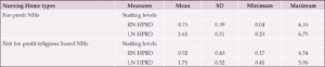 In examining the differences in nurse staffing levels in these two nursing home types, a descriptive and Mann-Whitney U analyses of nurses’ HPRD were conducted. Analysis, shown in Table 1, revealed a mean LN HPRD that was more than double the mean RN HPRD for FP NHs while the mean RN HPRD was about 54% of the mean LN HPRD in not-for-profit religious-based NHs. There were higher average hours for both RN and LN in the NFPRB nursing homes compared to FP nursing homes. In each category of nursing homes, the minimum and maximum hours were generally lower for RN than LN. However, the minimum staffing levels were lower in FPs compared to NFPRB NHs while the reverse was observed for the maximum levels. Mann-Whitney U analysis of these measures (table not included) also revealed higher means of the ranked variables for the NFPRB NHs in the areas on RN and LN staffing levels than their FP counterpart. Compared to the NFPRB NHs, higher number of FP NHs did not meet staffing levels for RN and LN.