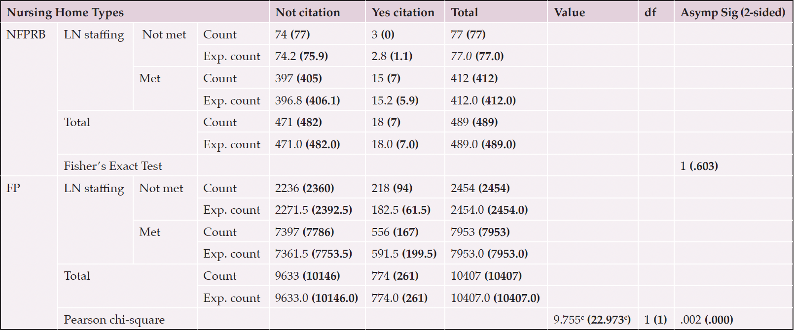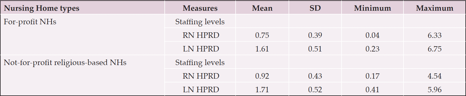 Although researchers have shown that adequate and appropriate staffing levels of nurses are important for quality care delivery and outcomes for older adults nursing home residents, studies that examined and compared the relationship between registered and licensed nurse staffing levels and staffing related deficiencies in for-profit and not for-profit religious-based nursing homes were very rare. Most studies have focused on the for-profit and not-for-profit categories of nursing homes. It was important to examine staffing-related quality deficiencies occurring in these nursing homes for care services improvement and policy changes that have the potential of maintaining the physical, mental, and psychosocial well-being of older adults. This study intended to fill the gap in the literature by comparatively examining the differences in adherence to registered and licensed nurse staffing levels and their effects on residents’ staffing related deficiencies in these two nursing home types. We hypothesized that there was a difference in registered and licensed nurse staffing levels and occurrences of staffing related quality deficiencies between for-profit and not for-profit religious-based nursing homes.