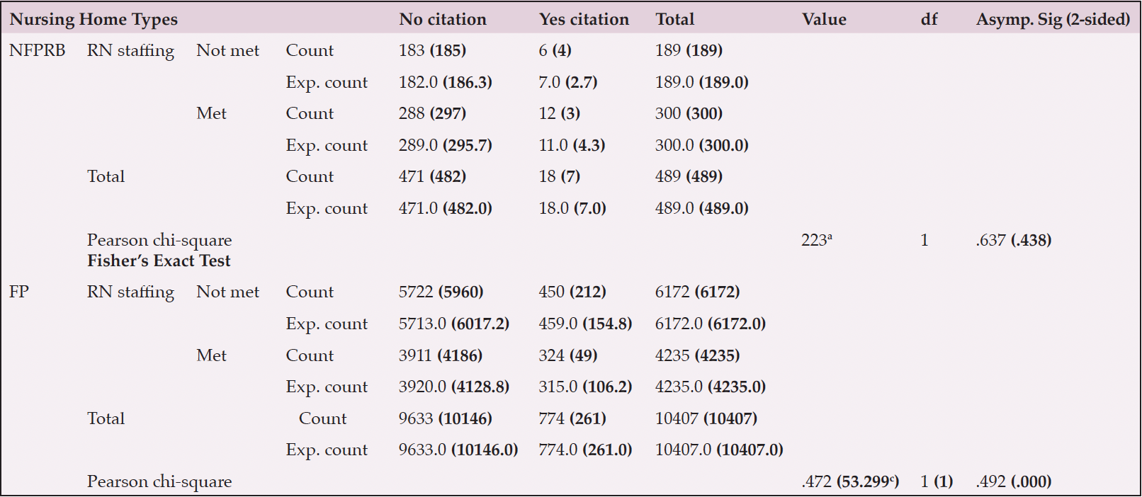 RN staffing levels and F354 deficiency count values are in bold. Fisher’s Exact Test used for RN staffing levels and F354 deficiency count in NFPRB NHs.