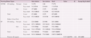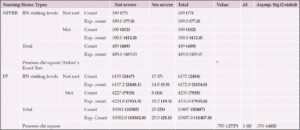 In Tables 2 through 4, the relationship between staffing levels and F353/F354 deficiency citation counts and F353 severity levels were examined using Crosstabs/Chi-square and Fisher’s Exact tests. Findings showed that association between nurse staffing levels and deficiencies in the not-for-profit religious-based NHs was not significant. The not-for-profit religious-based NHs had an insignificant number of severe deficiency levels J, K, and L for F353. In the for-profit NHs, results were statistically significant for RN staffing and F354 deficiency counts and LN staffing and both F353 and F354 deficiency counts. The relationship between RN staffing and F353 deficiency counts and between RN/LN staffing and F353 severity levels were insignificant.