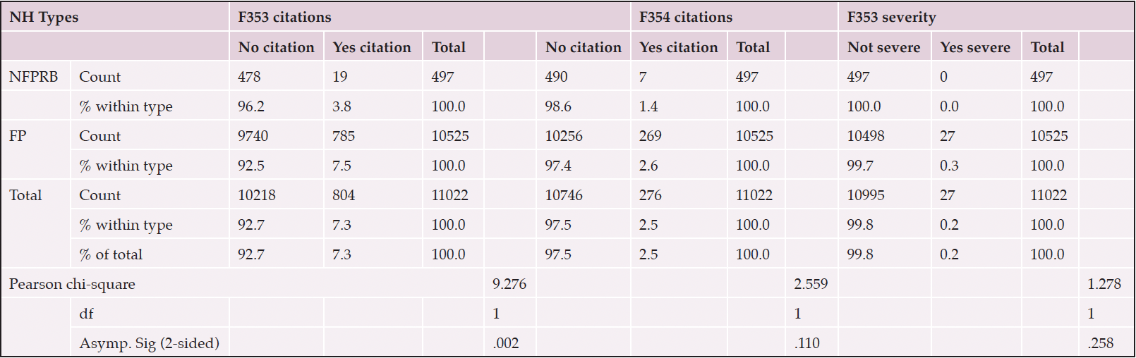 Differences in the occurrences of staffing related quality deficiencies (F353 and F354 citations; F353 deficiency severity) were reported in Table 5. A lower number of deficiency citation counts for F353 and F354 were observed in the not-for-profit religious-based NHs than the FP NHs. Staffing deficiency severity, F353, was observed among the for-profit NHs, none was observed for the NFPRB NHs. Chi-square was statistically significant for F353 deficiency citation counts but not significant for the remaining staffing related deficiency categories at X2(1, N = 11022) = 9.276, p = .002 (F353 citations), X2(1, N = 11022) = 2.599, p = .110 (F354 citations), and X2(1, N = 11022) = 1.278, p = .258 (F353 severity). While scores for staffing related deficiencies and severity were found to be worse for for-profit NHs, neither NH types had F354 deficiency severity.