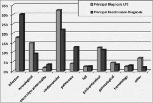 In the 261 subjects studied, average age was 79 years (± 10.4) and 42% were male. The principal diagnoses at time of admission to LTC facility were cardiovascular (34%), infection (20%), neurological (14%), gastrointestinal (13%), gynecological (4%), pulmonary (3%), fall (2%), electrolyte abnormality (including dehydration, 2%), hematology (1%) and other (6%, Figure 1).