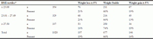 There was an apparent association between initial BMI and the magnitude of weight change, either percentage weight loss or weight gain. Subjects with lower initial BMIs consistently had greater fluctuations in body weight (increases or decreases of ≥ 5% of body weight) than those with higher BMIs over both 6- (Table 2) and 12- (Table 3) month periods. For example, 40% of those in the lowest BMI tertile had weight change (increase or decrease) of ≥ 5% over 6 months, compared to 27% in the highest tertile; while over 12 months 52% of the lowest tertile group had weight change of ≥ 5%, compared to 40% of the highest tertile group (P < 0.001).