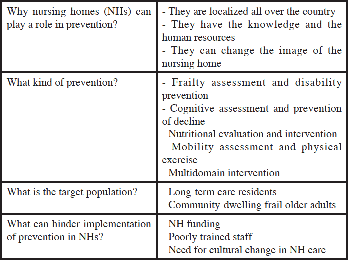 The aim of the workshop was to discuss intervention strategies to prevent disability and functional decline for NH residents. The second aim of the task force was to consider possible implementation strategies to prevent functional decline in community-dwelling frail elderly within the NH setting.